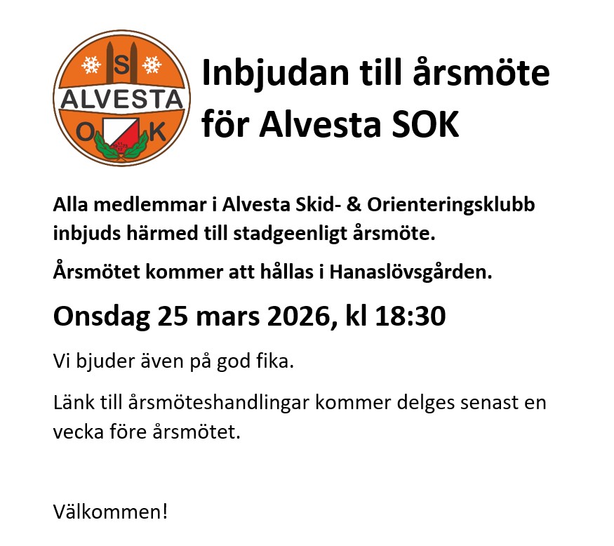 Härmed inbjuds alla medlemmar i Alvesta Skid- & Orienteringsklubb till stadgeenligt årsmöte. Årsmötet kommer att hållas i Hanaslövsgården.